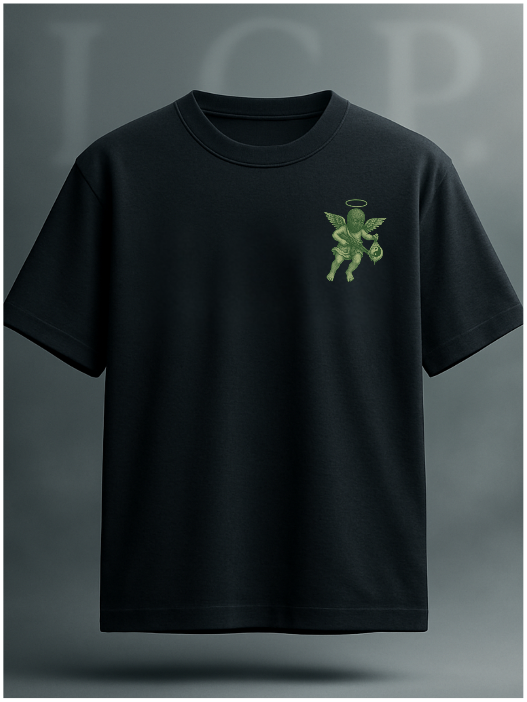 Printed in muted green tones reminiscent of U.S. currency, the artwork fuses symbolism with modern streetwear, making this piece both thought-provoking and wearable. The clean, structured silhouette of the shirt and soft cotton feel ensures a premium fit that holds its shape.